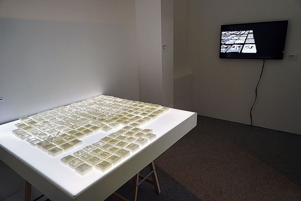 • Une imprimante 3D imprime les algorithmes des 256 formes tirées de la vidéo Digital Vocabulary. Elles sont ensuite disposées sur une table lumineuse suivant différentes configurations de matrice. Une matrice de 256 éléments (16 x 16) ou différentes matrices de 16 éléments (4 x 4).
