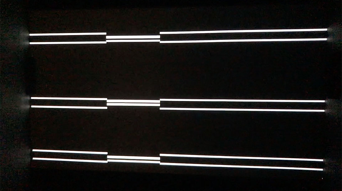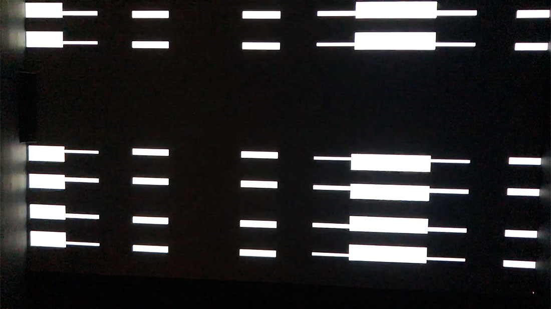 Dans l’environnement interactif de Generative ALU Form no 1, l’image est liée au son. La cohérence entre les deux se construit simultanément en interaction avec les variations que produit le visiteur en avançant dans la pièce et en mouvant ses bras. Ainsi, quand le visiteur avance vers l’image, il varie simultanément la résolution de l’image et la décorrélation micro temporelle des composantes spatiales du son. Quand il bouge les bras, il varie le facteur d’agrandissement de l’image et la fréquence circulaire de l’Azimut, produisant ainsi des variations fines entre pulsations spatiales et variations de hauteurs des sons.
